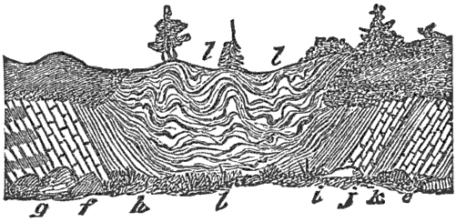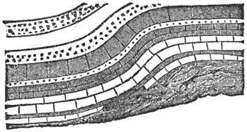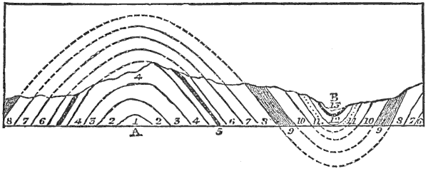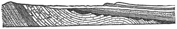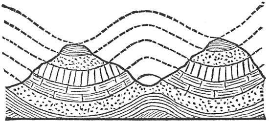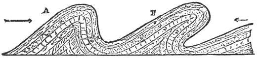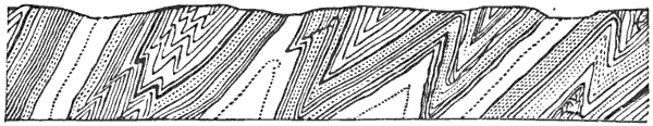 That the stratified rocks have, in many instances, suffered great disturbance subsequent to their deposition, is very evident; for, while the strata must have been originally approximately straight and horizontal, they are now often curved, or sharply bent and contorted, and highly inclined or even vertical. All inclined beds or strata are portions of great folds or arches. Thus we may feel sure when we see a stratum sloping downward into the ground, that its inclination or dip does not continue at the same angle, but that at some moderate depth it gradually changes and the bed rises to the surface again. Similarly, if we look in the opposite direction and think of the bed as sloping upward—we know that the surface of the ground is being constantly lowered by erosion, and consequently that the inclined stratum formerly extended higher than it does now, but not indefinitely higher; for, in imagination, we see it curving and descending to the level of the present surface again. Hence it forms, at the same time, part of one side of a great concave arch, and of a great convex arch, just as every inclined surface on the ground indicates both a hill and a valley. And guided by this principle we can often reconstruct with much probability folds that have been more or less completely swept away by erosion, or that are buried beyond our sight in the earth’s crust.
