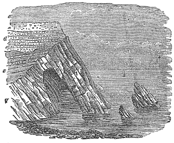 Behind our gravel-beach, or at its end, we have usually a cliff of rocks. As we approach this it is distinctly observable that the angular pebbles are more numerous, larger, and more angular; and a little observation shows that these are simply the blocks produced by jointing, and that the cliff is entirely composed of them. In other words, our cliff is a mass of natural masonry, which chemical agencies, the frost, and the sea are gradually disintegrating and removing. As soon as the blocks are brought within reach of the surf their mutual collisions make them rounder and smaller; and small round pebbles, sand, and clay are the final result.