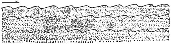 Mechanical Deposition.—Next let us notice what becomes of all this vast amount of clay, sand, and gravel after it is washed into the ocean. By taking up a glass of turbid water from our roadside rill, and observing that as soon as the water is undisturbed the sand and clay begin to settle, we learn that the solid matter is held in suspension by the motion of the water. But it does not remain in suspension long after being washed into the sea, for otherwise the sea would, in the course of time, become turbid for long distances from shore; and it is a well-known fact that the sea-water is usually clear and free from sensible turbidity close along shore and even near the mouths of large rivers, while at a distance of only 50 or 100 miles we find the transparency of the central ocean.