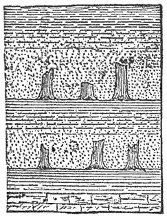 The general physical conditions under which peat is formed are familiar facts. We require simply low, level land, covered with a thin sheet of water and abundant vegetation; in other words, a marsh or swamp. If plants decay on the dry land, the decomposition is complete; they are burned up by the oxygen of the air to carbon dioxide and water just as surely as if they had been thrown into a furnace, though less rapidly, and nothing is returned to the soil but what had been taken from it by the plants during their growth. But if the plants decay under water, as in a peat-marsh or bog, the decay is incomplete, and most of the carbon of the wood is left behind. Now, if this incomplete combustion of vegetable tissues takes place in a charcoal-pit, where the wood is out of contact with air from being covered with earth, we call the carbonaceous product charcoal; but if under the water of a marsh, in Nature’s laboratory, we call the product peat. Peat is simply a natural charcoal; and, just as in ordinary charcoal, its vegetable origin is always perfectly evident. But when the deposit becomes thicker, and especially when it is buried under thick formations of other rocks, like sand and clay, the great pressure consolidates the peat; it becomes gradually more mineralized and shining, shows the vegetable tissues less distinctly, becomes more nearly pure carbon, and we call it in succession lignite, bituminous coal, and anthracite.