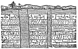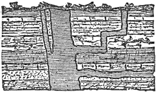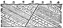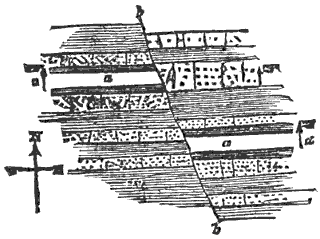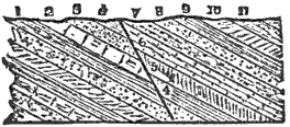 A few important faults have been observed, however, in which the foot-wall[**no hyphen before] has fallen and the hanging-wall[**] has risen (Fig. 29). These are known as reversed faults; and they indicate that the strata were in a state of lateral compression, the broken ends of the beds having been pushed horizontally past each other, so that a vertical line or shaft may intersect the same bed twice, as has been actually demonstrated in the case of some beds of coal.