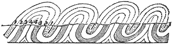 Besides the anticlinal and synclinal folds already explained, there are folds that slope in only one direction, one-sided or monoclinal folds (Fig. 23). Anticlinal and synclinal folds are symmetrical when the dip or slope of the strata is the same on both sides and the axial plane is vertical. The great majority of folds, however, are unsymmetrical, the opposite slopes being unequal, and the axial planes inclined to the vertical (Fig. 24, A). This means that the compressing or plicating force has been greater from one side than from the other, as indicated by the arrows. It acted with the greatest intensity on the side of the gentler slope, the tendency evidently having been to crowd or tip the fold over in the direction of the steep slope. When the steep slope approaches the vertical, this tendency is almost unresisted, and when it passes the vertical, gravitation assists in overturning the fold (Fig. 24, B). Such highly unsymmetrical folds, including all cases where the two sides of the fold slope in the same direction, are described as overturned or inverted, although the latter term is not strictly applicable to the entire fold, but only to the strata composing the under or lee side of it. Fig. 24, B, shows that these beds are completely inverted, the older, as the figures indicate, lying conformably upon the newer. This inversion is one of the most important features of folded strata, and it has led to many mistakes in determining their order of succession. In the great mountain-chains, especially, it is exhibited on the grandest scale, great groups of strata being folded over and over each other as we might fold carpets. An inverted stratum is like a flattened S or Z, and may be pierced by a vertical shaft three times, as has actually happened in some coal mines. Folds are open when the sides are not parallel, and closed when they are parallel, the former being represented by a half-open, and the latter by a closed, book. Closed folds are usually inverted, and when the tops have been removed by erosion (Fig. 25), the repetition of the strata may escape detection, and the thickness of the section be, in consequence, greatly overestimated. Thus, a geologist traversing the section in Fig. 25 would see thirty-two strata, all inclined to the left at the same angle, those on the right apparently passing below those on the left, and all forming part of one great fold. The repetition of the strata in reverse order, as indicated by the numbers, and the structure below the surface, show, however, that the section really consists of only four beds involved in a series of four closed folds, the true thickness of the beds in this section being only one-eighth as great as the apparent thickness.