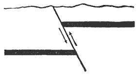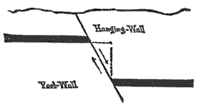 The rock above an inclined fault, vein, or dike (Fig. 28) is called the hanging wall, and that below the foot wall. Now inclined faults are divided into two classes, according to the relative movements of the two walls. Usually, the hanging wall slips down and the foot wall slips up, as in Fig. 28. Faults on this plan are so nearly the universal rule that they are called normal faults. They indicate that the strata were in a state of tension, for their broken ends are pulled apart horizontally, so that a vertical line may cross the plane of a stratum without touching it.