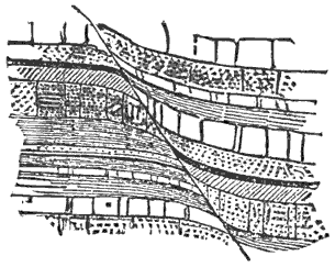 Important faults are rarely simple, well-defined fractures; but, in consequence of the enormous friction, the rocks are usually more or less broken and crushed, sometimes for a breadth of many feet or yards. The fragments of the various beds are then strung along the fault in the direction of the slipping, and this circumstance has been made use of in tracing the continuation of faulted beds of coal. In other cases the direction of the slip is plainly indicated by the bending of the broken ends of the strata (Fig. 35), and the beds are sometimes turned up at a high angle or even overturned in this way.
