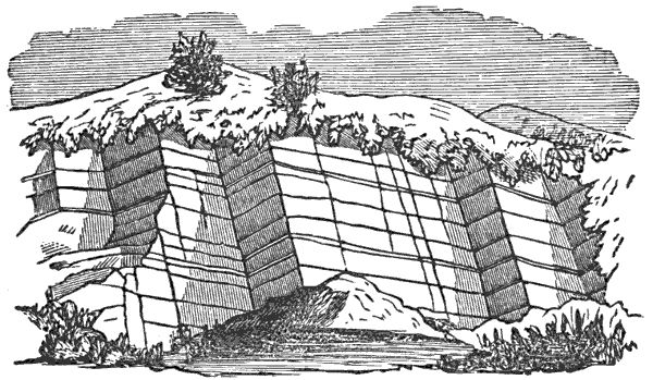 Joints and Joint-structure.—This is the most universal of all rock-structures, since all hard rocks and many imperfectly consolidated kinds, like clay, are jointed. Joints are cracks or planes of division which are usually approximately vertical and traverse the same mass of rock in several different directions. They are distinguished from stratification planes by being rarely horizontal, and from both stratification and cleavage planes by being actual cracks or fractures, and by dividing the rock into blocks instead of sheets or layers. The art of quarrying consists in removing these natural blocks; and most of the broad flat surfaces of rock exposed in quarries, are the joint-planes (Fig. 36). Some of the most familiar features of rock-scenery are also due to this structure, cliffs, ravines, etc., being largely determined in form and direction by the principal systems of joints; and we have already seen that the same is true of veins and dikes.