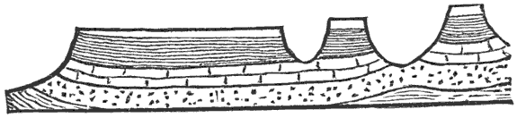 Subsequent Structures produced by the Superficial or Aqueous Agencies.—The superficial agencies, as we have seen in the section on dynamical geology, are, in general terms, water, air, and organic matter. Geologically considered, the results which they accomplish, may be summed up under the two heads of deposition and erosion—the formation of new rocks in the sea, and the destruction of old rocks on the land. In the rôle of rock-makers they produce the very important original structures of the stratified rocks; while as agents of erosion they develop the most salient of the subsequent structures of the earth’s crust—the infinitely varied relief of its surface. As a general rule, to which recent volcanoes are one important exception, the original and subterranean structures of rocks are only indirectly, and often very slightly, represented in the topography; for this, as we have seen, is almost wholly the product of erosion. Therefore, what we have chiefly to consider in this section is to what extent and how erosion is influenced by the pre-existing structures of rocks.
