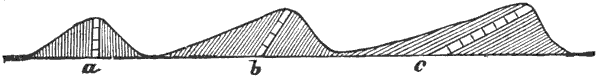 The folds or undulations of the strata may be profitably compared with water-waves. In fact, the comparison is so close that they have been not inaptly called rock-waves. Folds, like waves, unless very large, rarely continue for any great distance, but die out and are replaced by others, giving rise to the en echelon or step-like arrangement. The plan of both a wave and a fold is a more or less elongated ellipse, each stratum in a fold being semi-ellipsoidal or boat-shaped. In other words, a normal fold is an elongated mound of concentric strata, being highest at the centre, sloping very gradually toward the ends, and much more abruptly toward the sides.