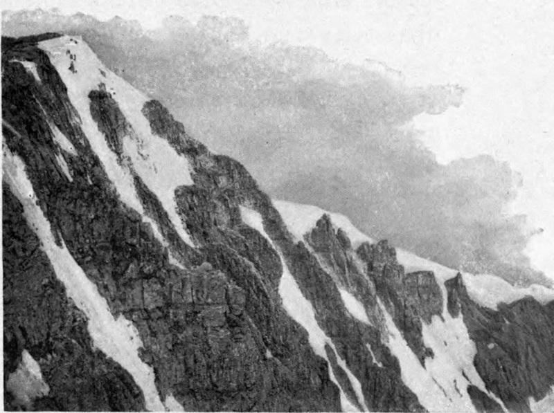 I was standing at a point some two miles distant looking at this imposing mountain, when from the vertical ice wall a great fragment of the glacier, some three hundred feet thick and several times as long, broke away, and, slowly turning in mid-air, began to fall through the airy abyss. In a few seconds, amid continued silence, for the sound had not yet reached me, the great mass struck a projecting ledge of rock after a fall of some half thousand feet, and at the shock, as though by some inward explosion, the block was shivered into thousands of smaller fragments and clouds of white powdery ice. Simultaneously came the first thunder of the avalanche. The larger pieces led the way, some whirling around in mid-air, others gliding downward like meteors with long trains of snowy ice dust trailing behind. The finer powdered debris followed after, in a long succession of white streamers and curtains resembling cascades and waterfalls. The loud crash at the first great shock now developed into a prolonged thunder wherein were countless lesser sounds of the smaller pieces of ice. It was like the sound of a great battle in which the sharp crack of rifles mingles with the roar of artillery. Leaping from ledge to ledge with ever increasing velocity, 34 the larger fragments at length reached the bottom of the precipice, while now a long white train extended nearly the whole height of the grand mountain wall 2500 feet from base to top.