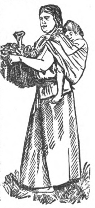 The men share the troubles of nursing with the women, and the babies, tied on their mother's or father's back, seem as content as if they were rocked in downy cradles. Babies, as soon as born, are clad in pantaloons and loose waist, irrespective of sex. There are no three-yard skirts on them. Boys retain this garb, but girls, when able to walk, are wrapped twice around the body with a straight cloth which serves for skirts.