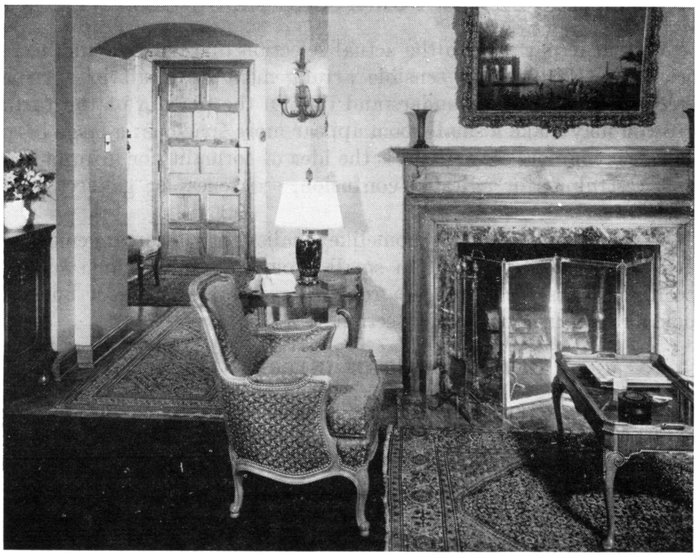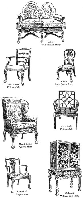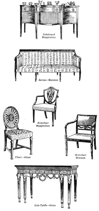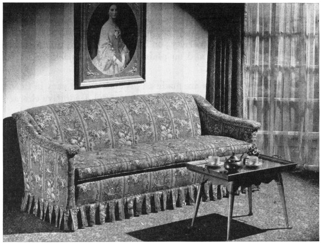 For the living room are offered "upholstered pieces—sofas, wing chairs, easy chairs, open armchairs, 'tailored' in effective coverings; but which may be purchased in muslin and tailored in fabrics of your own selection." Look at these noteworthy dependable furniture friends: