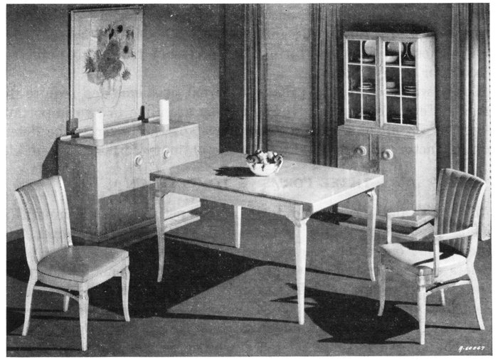 For the dining room there are Sheraton-Hepplewhite groups of "genuine mahogany construction rubbed and then waxed to its deep rich red color." Choice is offered of pedestal dining table, or one of the leg type; also "choice of the famous Hepplewhite shield back or Sheraton model chairs." Other offerings include an Adam group in "genuine Honduras mahogany with beautifully figured swirl mahogany veneers, delicately carved"; an English Chippendale group; an Early American group of solid rock maple construction. Separate pieces for the apartment dining room from which one may create his own ensemble include offerings of a—