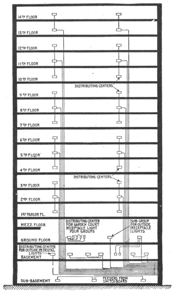 The power bars are supplied with current from the lighting bars, a non-reversible or so called constant current booster being interposed between the two as shown in fig. 1,202. Since this permits only a constant current to pass from the lighting bus bars, the load on the dynamo does not vary, although the load on the power busses may vary widely.