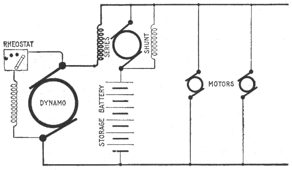 From the foregoing description it will be seen that the compound booster is automatic within certain limits of battery charge. Any marked change of battery voltage will be followed by a corresponding change in dynamo current, unless the rheostat be manipulated to bring battery voltage + booster voltage back to normal.