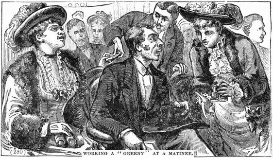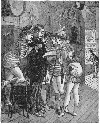 | Front Door and Back Door Entrances—"Mashers" at the "Stage-Door"—The Cerberus who Stands Guard—Perquisites Paid to Him—Bulkhead and the Ballet Girls—The Tricks of the Scene Painter on the Girls—The Girls' Revenge—Bold and Heartless Lovers—Notes Pushed under the Dressing-Room Door—Alice Oates's Mash—Watching the Manœuvres of the "Mashers"—Tale of the Pink Symmetrical | 43–54 |