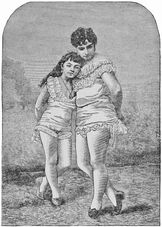 A curiosity that has been before the public for almost twenty years is the "two-headed woman," Millie Christine. The fact of the matter is that there are two women joined together below the waist, but as they have a single physical organization their manager has seen fit to call them one. This freak of nature is more astonishing than were the Siamese twins or the Hungarian sisters. The two-headed woman was born597 of slave parents on the plantation of Alexander McCoy near the town of Whiteville, Columbus County, North Carolina, on July 11, 1851. Prior to this Millie Christine's mother had given birth to five boys and two girls, all of ordinary size and without deformity. The "two-headed woman" will be best understood by reading an extract from a lecture by Prof. Pancoast of the Jefferson Medical College, Philadelphia. The Professor examined this curiosity and discussed upon the subject before a large gathering of medical men. In introducing Millie and Christine, he said he considered them the most interesting monstrosity of their class that has ever come under the notice of scientific men, far more interesting than the Siamese twins. In the midst of his discourse the young ladies entered, clad in green silk on their two bodies, pretty little bronze boots on their four feet, white kids on their four hands. They moved forward like an expanded V, with a crab-like movement that was not ungraceful. Born back-to-back; the Professor explained that the natural desire of each to walk face forward had twisted them in their present position. Separate entities, separate individualities, each can pursue separate lines of thought and conversation independent of the other. From habit their appetites call for food and drink at the same time. All the ills of flesh are not, however, necessarily theirs in common. One may have the toothache and the other be free from any ache. But in the examination conducted to-day the Professor discovered a remarkable development of sensibility since his previous examination, eight years ago. Touching them on any extreme of the body, on any foot, for example, both in common were conscious of the touch. Christine has been and is now the larger and stronger of the two. As children they used to598 have little struggles and quarrels for supremacy, but, as they could not get away from each other, they early concluded that the best way to get along in their novel path through life was to yield to each other. Their present happiness and affection for each other is an example for couples who are yoked together in marital bonds. Sometimes Christine rolls over Millie in bed without awakening her. Both can sleep separately. They can stand and walk on their outside legs, but they prefer to walk on all fours. Millie cannot lift up Christine's legs, or Christine Millie's legs. Since the Hungarian sisters, there has been no similar case reported reaching adult life for one hundred and seventy years. The bond of union between these, which is just above the bones of the spine, is chiefly cartilaginous, but the spines are so closely approximated that there is an osseous union between them. To the question by Professor Pancoast, whether either was engaged to be married, each denied the soft impeachment with decision, though the Professor explained that physically there are no serious objections to the marriage of Her or Them; but morally there was a most decided one. During the Professor's lecture the Misses Christine Millie and Millie Christine appeared very much interested in the diagnosis of their singular condition and evidenced their superior intelligence by their apt and ready answers.