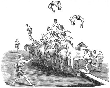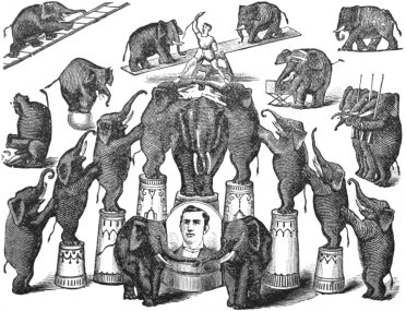 The menagerie, no matter how small or how extensive it may be, always has much within its cages and lying around under its canvas to interest young and old alike. It is like a volume of natural history that may be forever studied without exhausting the interest that attaches to it, and the knowledge contained in it. Thrown down after a single perusal, the book is picked up again and again, and each time its pictures and pages seem as fresh and entertaining as they were in the beginning. So, too, the collection of curiosities, that now-a-days form a very important part of every tent-show, never loses its attraction for the public. Gray-haired men who in boyhood looked, open-mouthed and astonished, into the den of lions, still find the same pleasure in contemplating these608 wonderful beasts from a safe distance, and take delight in making their children acquainted with them. The tangled forests and matted jungles of new regions are constantly giving up new specimens of wild animal life; and with the old reliable attractions still plentiful, and startling novelties occasionally coming to the surface, there is every reason to believe that the menagerie will retain its present hold upon the hearts of the people, and last as long as there is canvas in the world to cover one or color enough to fill an ordinary stand of bills.