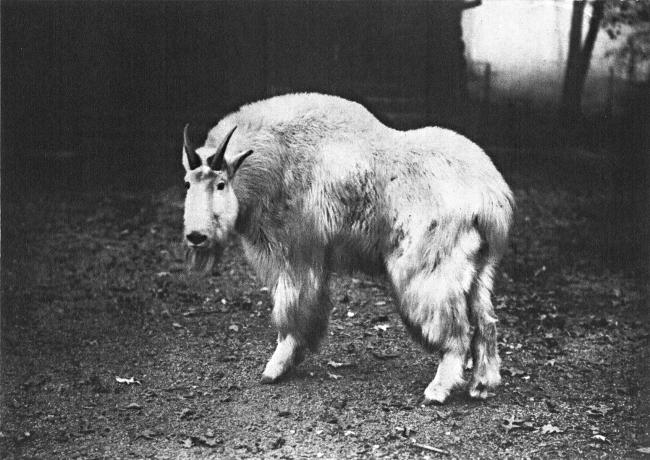The white goat is odd in appearance. At first glance it seems to be a slow, clumsy creature; in fact, it is the most expert and daring rock climber of all American hoofed animals. The hoofs are small, angular and very compact and consist of a combination of rubber-pad inside and knife-edge outside to hold the goat equally well on snow, ice or bare rock. It is said that goats will cross walls of rock which neither man, dog nor mountain sheep would dare attempt to pass. Sometimes they walk along the face of a precipice of apparently smooth rock; yet in doing so they frequently look back and turn around whenever they feel so inclined. The white goat is built something on the order of a small American bison. Its head is carried low and the horns are small and short. Its hair is yellowish-white. Next to the skin is a thick coat of fine wool through which grows a long outside thatch of coarse hair.