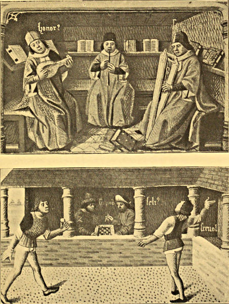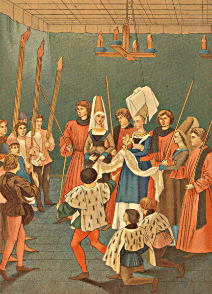 Each course was proclaimed heraldically by blasts of horns and motets from the music gallery. The high table was served by knights and men of rank, who bore the splendid bowls and dishes upon napery of cloth of gold. The richer viands were enclosed in golden caskets, and the keys offered to the guests, who in turn unlocked them and took or refused their contents. Some of the confections have not their parallel to-day. One table, for example, was made to represent a stag-hunt, another a village revel, one a castle with a moat of rare vintage, another an abbey church with bells pealing and hidden children singing. Small animals and birds, and actually growing trees and flowers, were used. The roast and the dessert were the pièces de résistance; each was carried up the hall in gay procession with much ceremonious bowing, and guarded by archers of the guard in gorgeous liveries. At the sight of any very splendid and appealing course the whole lordly company were wont to burst out into song—a[340] well-known and lengthy chanson; it was called “Le Sauve-garde de ma Vie.”