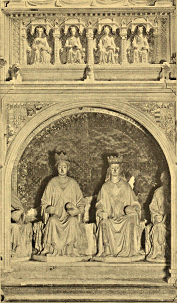 The monument to King René, which she at last came to share in blessed memory, had his effigy reclining, and at his feet a sculptured lion, symbol of courage; at Jehanne’s feet were carved two hounds, emblematic of fidelity. The Chapel of St. Bernardin thus became the royal mausoleum of the last Anjou dynasty—René, with his father and mother, his two wives, his eldest son, and his two daughters, in holy company; and so they remained for 300 years, until that cataclysmatic year 1793, when every holy stone was tumbled down and every reverent memorial defaced. The memorial chapel was for centuries a thing of beauty. King René himself painted the glass windows and designed the tomb. Soon after his marriage with Jehanne de Laval he employed Francesco Laurana and Pietro da Milano to decorate the chapel.