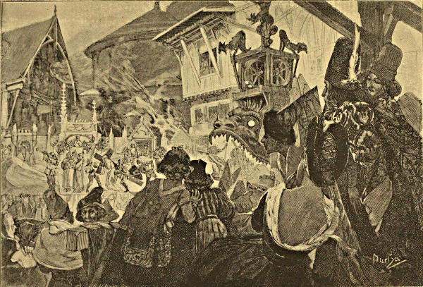 One of the most admirable works of the King and Queen,—for Jehanne was not only the amanuensis of her husband, but his inspirer also,—was the conception and the elaboration of the procession of the “Fête Dieu” and “Les Jeux de la Tarasque.” This pageant originated in the mind of René when, as a youth, he witnessed with emotion in 1427, at Bar-le-Duc, “La Mystère de la Passion,” under the direction of Conrad Bayer, Bishop of Metz. Thirty years of war and travel did not banish the impression the young Christian warrior gained, and from time to time in Anjou and elsewhere he composed rondeaux, ballades, and chansons, in a masque or mystery which he called “Le Roy Avenir.” In 1474 the King and Queen assisted at Aix at the first rendition of “Les Jeux de la Fête Dieu.” This was preceded by “La Procession du Sacré”—the Procession of the Sacred Host. All the clergy, nobles, troubadours, pretty women, and gallant knights, of Provence assisted, and all the trade corporations took part. Everybody in the procession carried upon the tip of a white wand a piece of pain béni. Each section of the cortège was a moving spectacle or pageant. The first section, by acclamation, exhibited “Lon Grand Juée deis Diables”—the Grand Play of the Devils. The devils were black and red and green, and every youth’s ambition was to figure as a Prince of Darkness; indeed, in later times a young fellow based his claim to be a devil on the fact that his father and all his[338] ancestors had been devils, so “c’est pourquoi ne le serrais je pas!”