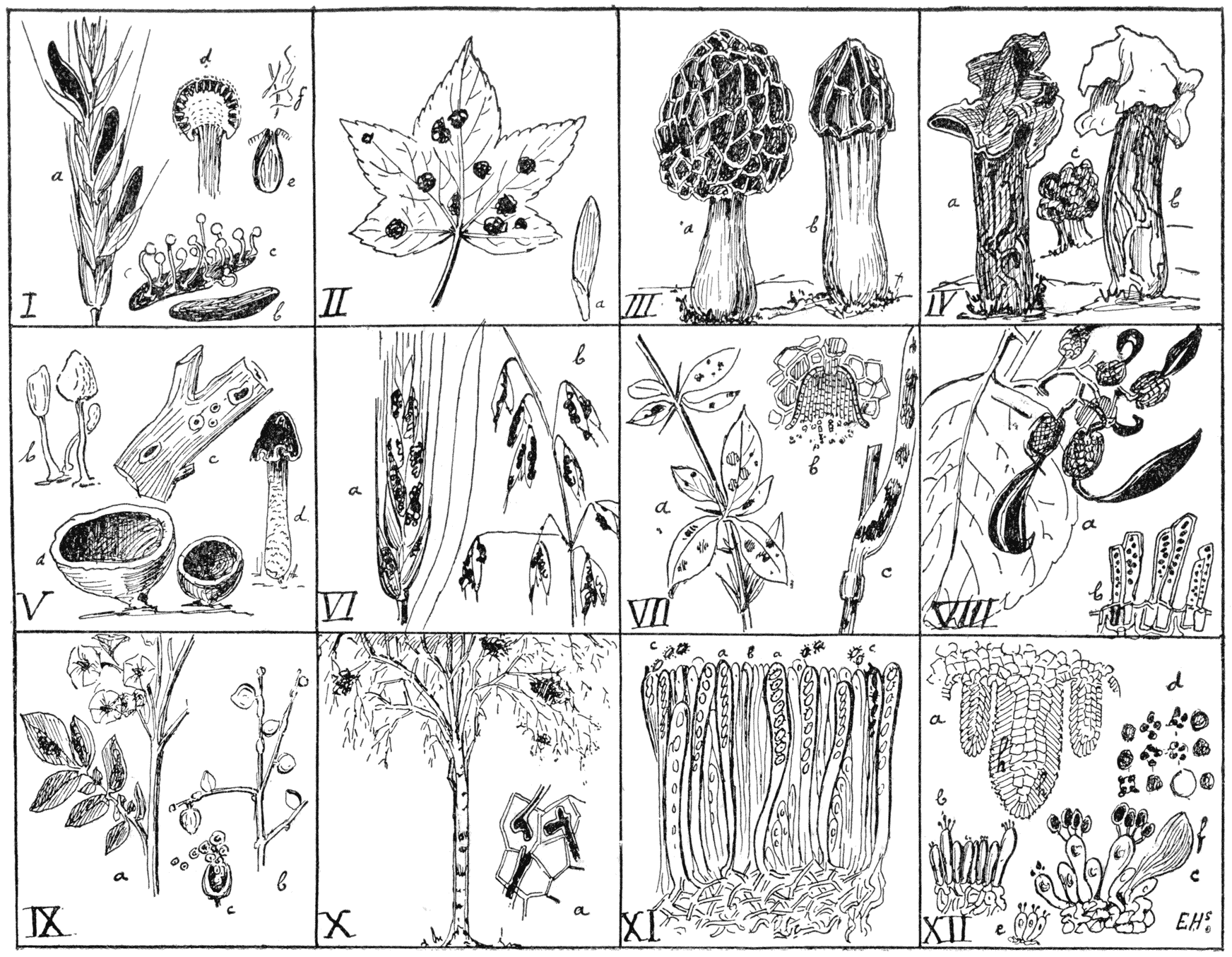 Heel wat kwaadaardiger zijn een aantal andere schimmels, die de belangrijkste voedingsplanten van den mensch, de granen, aantasten. Overbekend is onder [17]deze vooral het moederkoorn (Cláviceps purpúrea) (Pl. 1 fig. I), dat de rogge niet alleen oneetbaar maakt, maar zelfs de voedzame korrel in een zwart en giftig ding verandert. Vooral in vroeger tijd, toen men nog niet zoo scherp op al die dingen lette, heeft die veel kwaad gedaan. In groote hoeveelheid met het rogge vermengd en er mede gemalen, veroorzaakte het de “kriebelziekte”, die den dood ten gevolge kan hebben.