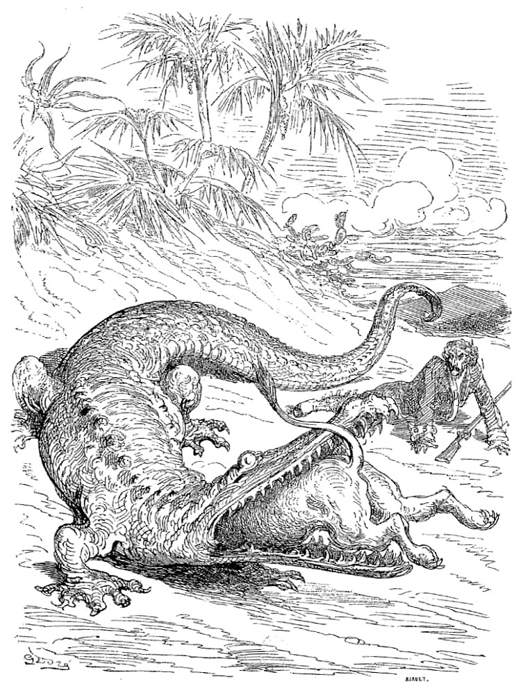 Après que nous eûmes passé quelque temps dans sa gueule, il la rouvrit pour engloutir une énorme masse d'eau: notre navire, soulevé par ce courant, fut entraîné dans l'estomac du monstre, où nous nous trouvions comme si nous eussions été à l'ancre pris d'un calme plat. L'air était, il faut en convenir, chaud et lourd. Nous vîmes dans cet estomac des ancres, des câbles, des chaloupes, des barques et bon nombre de navires, les uns chargés, les autres vides, qui avaient subi le même sort que nous. Nous étions obligés de vivre à la lumière des torches; il n'y avait plus pour nous ni soleil, ni lune, ni planètes. Ordinairement nous nous trouvions deux fois par jour à flot et deux fois à sec. Quand la bête buvait nous étions à flot, lorsqu'elle lâchait l'eau nous étions à sec. D'après les calculs exacts que nous fîmes, la quantité d'eau qu'elle avalait à chaque gorgée eût suffi à remplir le lit du lac de Genève, dont la circonférence est de trente milles.