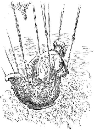 Alors je songeai au retour. Mais, ô désespoir! la chaleur du soleil avait flétri la tige de mon pois, si bien que je ne pouvais descendre par cette voie sans risquer de me casser le cou. Que faire? je tressai avec la paille une corde aussi longue que je pus: je la fixai a l'une des cornes de la lune, et je me laissai glisser. Je me soutenais de la main droite, j'avais ma hache dans la gauche: arrivé au bout de ma corde, je tranchai la portion supérieure et la rattachai à l'extrémité inférieure: je réitérai plusieurs fois cette opération, et je finis, au bout de quelque temps, par discerner au-dessous de moi la campagne du sultan.
