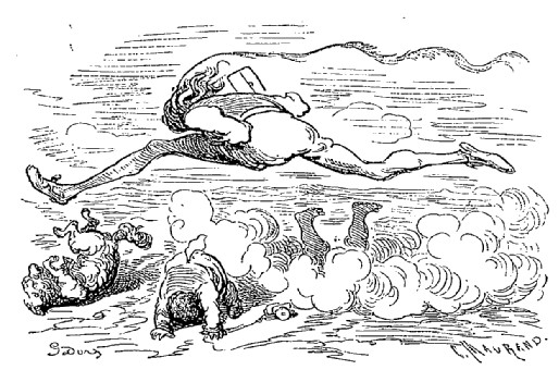 Comme j'avais encore un bon bout de chemin à faire, et que cette quantité de canards m'incommodait singulièrement, je commençai à regretter d'en avoir tant pris. Mais sur ces entrefaites il survint un événement qui, au premier moment, me causa quelque inquiétude. Les canards étaient encore tous vivants: revenus peu à peu de leur premier étourdissement, ils se mirent à battre de l'aile et à m'enlever en l'air avec eux. Tout autre que moi eût assurément été fort embarrassé. Mais moi j'utilisai cette circonstance à mon profit, et, me servant des basques de mon habit comme de rames, je me guidai vers ma demeure. Arrivé au-dessus de la maison, lorsqu'il s'agit de parvenir à terre sans me rien casser, je tordis successivement le cou à mes canards, et je descendis par le tuyau de la cheminée, et, à la grande stupéfaction de mon cuisinier, je tombai sur le fourneau qui par bonheur n'était pas allumé.