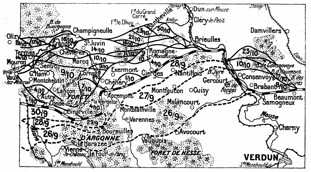 The German forces, following the retreat of the French Armies, slipped in on either side of the thick woods of the Argonne, along the Valleys of the Aisne and the Aire.