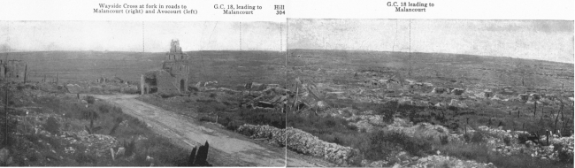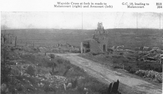 One kilometre beyond Hill 285 is the Sept-Fontaines cross-roads, where stood a French dressing-station, facing the road going towards the Mont-de-Villers.