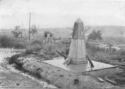 Almost at the top of the hill the road runs past a German cemetery containing a curious monument (4 km. from Four-de-Paris; photo above).