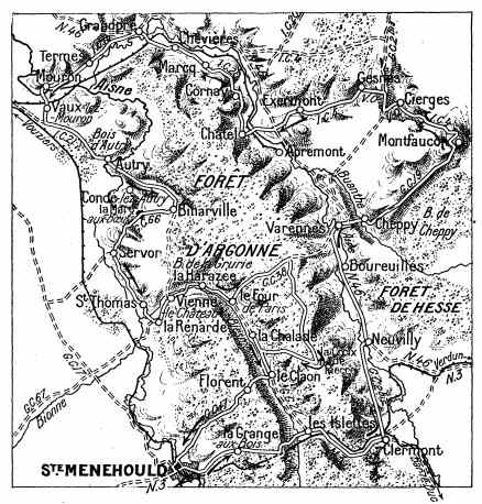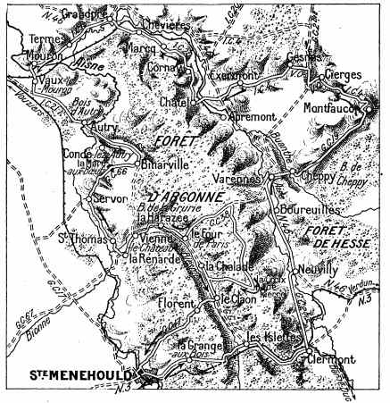 (1) The main road from Varennes to Vienne-le-Château, via the Four-de-Paris, where a road running north-south branches, crossing at Les Islettes, the “National Road,” and the railway from Châlons-sur-Marne to Verdun, via Sainte-Menehould.