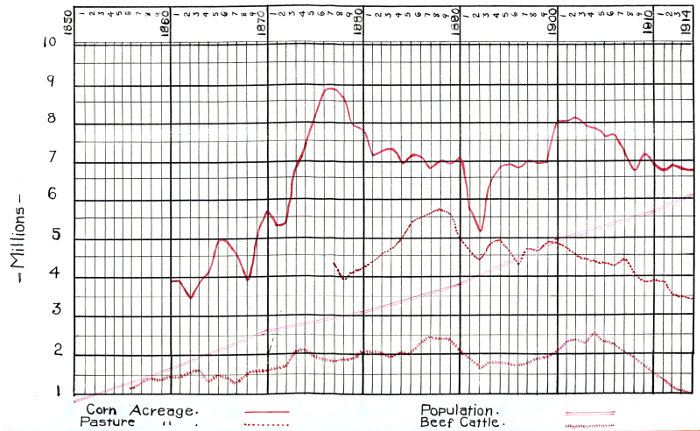 Showing the corn acreage, pasture acreage, number of beef cattle, and the population of the state of Illinois from 1850 to 1914 inclusive.
