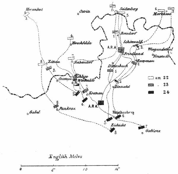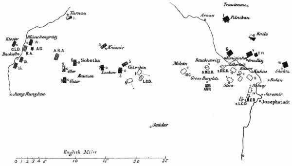 [10] Gitschin, Jung Buntzlau, and Libau are shown on Map No. 6. The positions of the other places here mentioned are, in reference to Gitschin, as follows: Aulibitz, nearly 4 miles east; Chotec, about 7 1/2 miles east; Konetzchlum, about 6 1/2 miles east-south-east; Milicowes, about 4 1/2 miles south-south-east; Podhrad, about 2 miles south-west; Robaus, about 2 miles east; Dworetz, near, and north of, Robaus.
