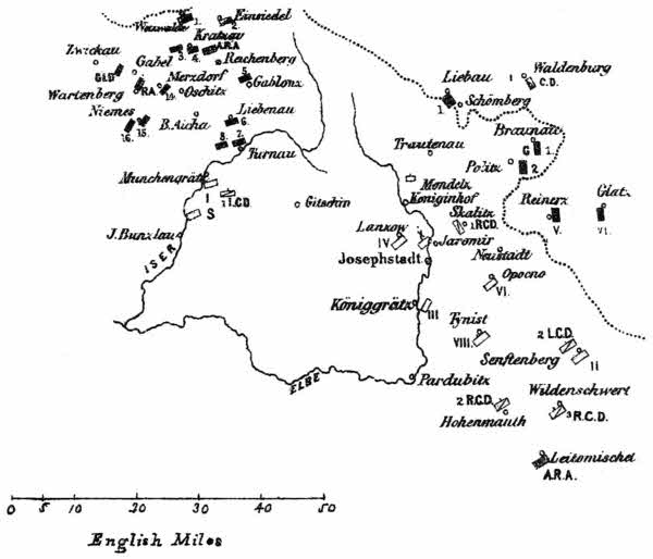Before the commencement of hostilities Von Benedek had, as we have seen, announced his intention of invading Prussia. Two routes offered themselves to his choice: one by way of Görlitz and Bautzen to Berlin; the other by way of the valley of the Oder into Silesia. The latter route was obstructed by the fortresses of Glatz, Neisse and Kosel; the former would have led to the unobstructed occupation of Saxony, and would have enabled the Bavarian army to concentrate, via the passes of the Saale and Wittenberg, with the Austrians and Saxons. But, at a time when minutes were worth millions, Von Benedek was slow; and the preparation and energy of the Prussians enabled them to take the initiative and throw the Austrians upon the defensive in Bohemia. Von Benedek then decided to concentrate his army in the vicinity of Josephstadt and Königinhof; to hold the strong defiles of the Iser or the Elbe with comparatively weak detachments, and throw his main army upon the Crown Prince or Frederick Charles, as circumstances might decide.