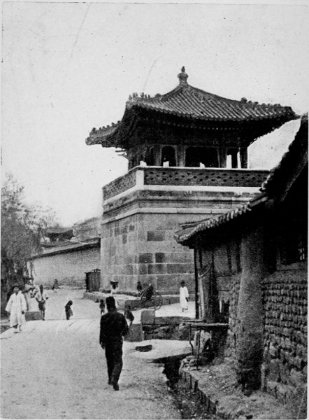 At the time of my arrival, and for some few years after, a very interesting custom was in vogue with regard to the closing of these gates. Korea had for centuries a signal fire service, by which news of peace or war was with telegraphic rapidity conveyed to Seoul, and by number, frequency of repetition and other expedients a tolerably useful code had been established. On the south mountain, within the walls, were four beacons, one for each point of the compass, to which these lines converged. Every evening as soon as the sun had set, when the bright glow of these four beacon fires published the fact that all was well in his majesty’s dominions, four officials, whose business it was to report to the king the message of the fires, presented themselves at the palace, and with low obeisance, each announced that all was well in the north—in the south—the east—and the west. On this, the palace band struck up its gayest airs, and when this music was heard, the signal was given for the tolling of the great curfew bell in the center of the city. When the extremely sweet and solemn, low and yet penetrating tones of this bell were heard, the ponderous gates were swung to and barred, not to be reopened till the ringing of the same bell at the first streak of dawn gave the signal to the keepers.