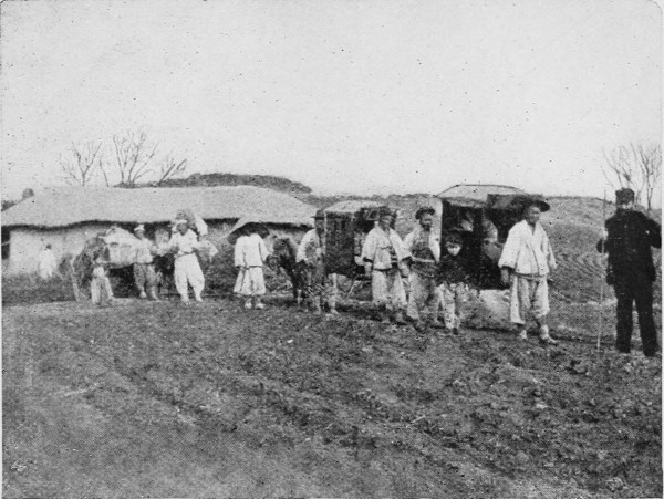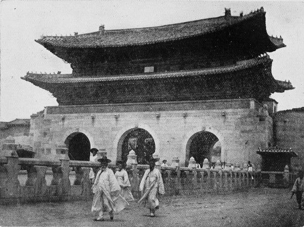The trip from Chemulpo to Seoul, about twenty-eight miles, was made the following day, in a Sedan-chair carried by four coolies. The road, although a much traveled one, was very bad, but is now replaced by a railroad which accomplishes the distance in about two hours and a half. The country I found pleasantly rolling—comparatively few trees were seen, and the population thereabout seemed quite sparse. Here and there were squalid mud huts thatched with straw. I found on inquiry that this little land, lying west of Japan, attached at its northern extremity to China and Siberia, has an area of about ninety 3 thousand square miles and a population of over fourteen millions of people, with a climate varying from that in the north, like northern New York, to that in the extreme south, like southern Virginia.