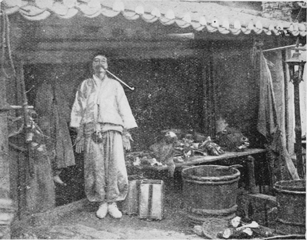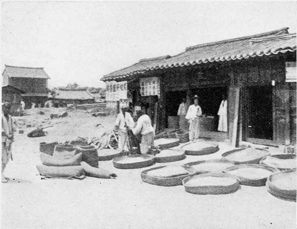Entering through these gates, fortunately not yet 4 closed, we saw narrow, filthy streets, flanked by low mud houses, either thatched with straw, or tiled. It has been aptly said that the city looks like a vast bed of mushrooms, since none of the Korean houses are built more than one story high.