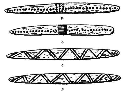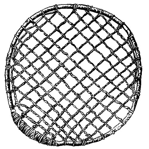 The wheel game is played with a netted hoop, strictly for amusement, by young people. The hoop in the collection is shown in Fig. 13.[41] The center mesh is called the navel and the open parts of the loops around the hoop, the teeth. The darts are simple pointed sticks about 80 cm. long without forks at the end as observed among some other tribes. Counts are made when the darts pierce the navel or one of the teeth, according to any value agreed upon by the players. Two persons are necessary to the game, but there is no maximum limit to the number of players. The opposing sides take up positions at fifty yards or more. A player rolls the wheel toward the opposite side, its players casting darts at it as it passes. Should a count be made the wheel is thrown back high in the air, the opposing side attempting to catch it on their darts. Should they in turn make a count, the wheel is thrown back to the other side, etc. For every failure to count, the wheel is returned by rolling.