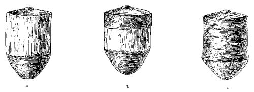 Top was a favorite game for boys. The wooden top (Fig. 8) is usually made of birch in the round and varies in length from 11 to 16 cm., in diameter from 8 to 12 cm. The bark is removed entire or in sections and the heads marked with nails or paint, partly for ornamentation and partly for identification. The wood must be well seasoned so as not to be heavy. The whips have four buckskin lashes about 35 cm. in length and handles about 75 cm. long. This game is played in soft snow, the object being to determine who can drive his top over the greatest distance without interrupting the spinning. The usual stakes are buckskin whip strings and tops.
