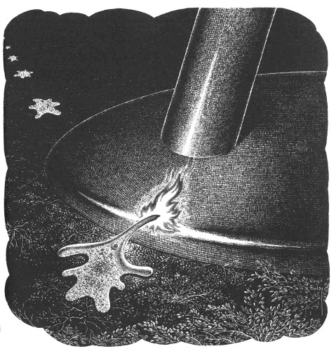 It was obvious that he must escape from this trap before his offspring destroyed him. Yet he could think of no way to avoid the poison metal. He recognized it now, the element with the twelve protons in its nucleus, a light metal seldom used by the Folk even in the days of their greatness because of its ability to rapidly oxidize and its propensity to burst into brilliant flame when heated. With sudden shock he realized that the artefact was nothing less than a gigantic torch!
