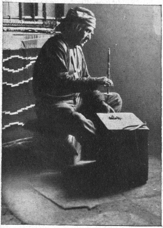 The Hopis possess arts of great interest. 128 Pottery of beautiful form and design is made at Hano[60] of the First Mesa. This tiny village has the honor of being the home of the most famous of Indian potters, Nampéyo, whose work is so exquisite that it looks distinctive in any company. Her daughter Kwatsoa seems nearly as gifted. Then there is basketry. Curiously enough the East Mesa makes no baskets whatever, and the baskets of the Middle Mesa are quite of another sort from those of the Third Mesa, and both so different from all other Indian baskets whatsoever, as to be recognized at a glance. The Third Mesa baskets are woven wicker work usually in the form of a tray or plaque, the design symbolizing birds, clouds, butterflies, etc., in glaring aniline dyes. Those of the Second Mesa are in heavy coils sewed together with a thread of the yucca wrapping, and 129 in various shapes from flat to globular, the latter sometimes provided with handles. Weaving is an ancient Hopi art that is now unfortunately decadent. In pre-Spanish days and for some time afterwards, the Hopi cultivated a native cotton,[61] and cotton is still woven by them into ceremonial kilts and cord. Formerly they were famous weavers of rabbit-skin blankets. The visitor may still run across an occasional one in the pueblos, but the blanket of wool has long since displaced them. The Hopis make of weaving a man’s business, which is usually carried on in the kivas when these are not being used for religious purposes. They specialize in women’s mantas, or one-piece dresses, of a dark color with little or no ornamentation.