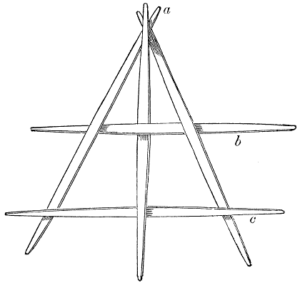 Take five tooth-picks, weave them together, as seen in the illustration, which perhaps is easiest done by holding the three diverging ones between the thumb and forefinger of the left hand at the point a, and insert the other two successively, first b, then c. Now lay the figure upon any flat surface, letting the end c extend a short distance beyond the edge. If you touch a lighted match to c, in a moment each stick will leap into the air as if suddenly endowed with life and animation, quite unusual in such inert objects.