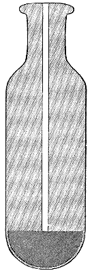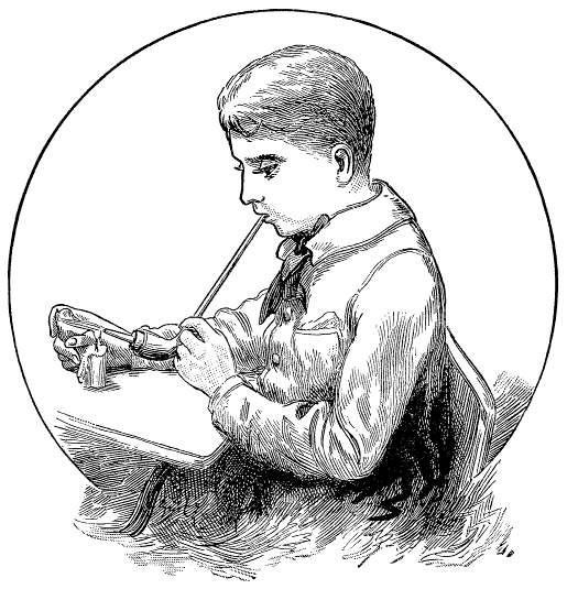 Although it is impossible to give any detailed account of glass blowing which would be practicable for small boys, yet a child can amuse himself for hours, by simply melting bits of glass and joining them together; or by melting small glass tubes and drawing them out to mere threads; or again, blowing them up into tiny balloons until their surface is as thin as a soap bubble and almost as fragile. These little tubes are smaller than the end of 28a pipe-stem, about four inches long, and made of very thin glass. A dozen can be procured for ten or twelve cents at any place where chemical supplies are to be found. A short tallow candle, held in a cheap tin candlestick, answers for the flame; and the tobacco-pipe, converted into the blowpipe just described, can be used in any of the experiments here given. Take a piece of a broken window pane, hold it in the left hand very near the candle flame, then holding the blowpipe so that the shorter end nearly touches the flame, blow steadily through the pipe-stem a current of air into the flame, which sends it upon the glass and soon reduces the part in contact with it to a red-hot melting mass; this can be worked into various shapes by forming it with the aid of pincers; or it can easily be joined to pieces of different colors, by holding the two together and turning the full force of the blaze upon them.