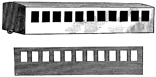 If you have no oil paints, it would be a good investment to get a few tubes, as they are not expensive, and are of invaluable assistance in adding beauty and naturalness to many things a boy can make. For the cars, a tube of chrome yellow, one of Indian-red, and one of black would be needed, but as those are not over seven or eight cents apiece the whole cost would be small. The windows can perhaps be most conveniently put on by “stencilling.” To do this, cut a piece of stout paper or thin cardboard the exact size of the side of the car, and mark the windows on it in their proper places (see Fig. 2). Then cut out the windows thus drawn with the point of a sharp penknife. Catch the card firmly upon the surface by 48driving two or three fine pins through it into the wood. Finally, with your brush moderately filled with the black paint, cover all the yellow surface exposed through the openings; then remove the card very carefully and one side of your car will be complete. After painting the whole set, another long time will be needed for drying. During the meantime obtain a few screw-eyes and hooks, and, when perfectly dry, screw a hook into the left and an eye into the right end of each car, join them into a train, and you will find you have a strong set of cars with which your little brother can play to his satisfaction, without a fear of breaking. The locomotive is more difficult to make, but with a little care any boy of ten can be quite certain of success.
