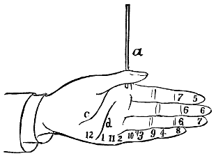 By knowing the last figure of the product of any two numbers, to tell the other figures. If the number seventy-three be multiplied by each of the numbers in the following arithmetical progression, 3, 6, 9, 12, 15, 18, 21, 24, 27, the products will terminate with the nine digits, in this order, 9, 8, 7, 6, 5, 4, 3, 2, 1; the numbers themselves being as follows: 219, 438, 657, 876, 1095, 1314, 1533, 1752, and 1971. Let, therefore, a little bag be provided, consisting of two partitions, into one of which put several tickets, marked with the number 73, and into the other put as many tickets, 3, 6, 9, etc., up to 27. Then open that part 40of the bag containing the number 73, and ask a person to take out one ticket only; after which, dexterously change the opening, and desire another person to take a ticket from the other part. Let them now multiply their two numbers together, and tell you the last figure of the product, by which you will readily determine from the foregoing series what the remaining figures must be. Suppose, for example, the numbers taken out of the bag were 73 and 12, then as the product of these two numbers, which is 876, has 6 for its last figure, you will readily know it is the fourth of the series and the other two figures must be 8 and 7.
