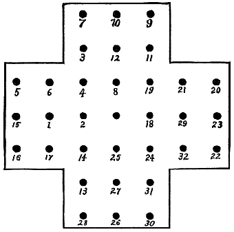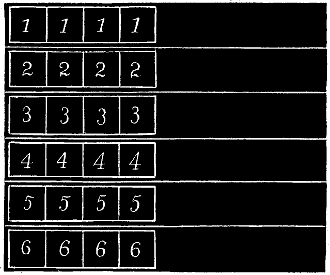 Out of thin cardboard—old business cards answer this purpose nicely—make thirty-two blank counters, the size of a dime. Then upon a piece of note-paper mark off a figure just three inches square, and divide it by lines into nine compartments, each containing one square inch. The puzzle is, to arrange the counters in the external cells of the square four different times, and each time to have nine in a row, yet to have the sum of the counters different, and varying from twenty to thirty-two. If you will inspect the following figures you will see how this is possible: the first represents the original disposition of the 39counters in the cells of the square; the second, that of the same counters when four are taken away; the third, the manner in which they must be disposed when these four are brought back with four others; and the fourth with the addition of four more. There are always nine in each external row, and yet in the first case the whole number is twenty-four, in the second it is twenty, in the third twenty-eight, and in the fourth thirty-two. The numbers are substituted in the place of the counters in the above figures for convenience, but Fig. 5 represents the disposition of the counters, as indicated in Fig. 2.