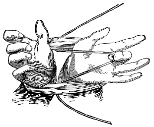 Hold a ring between thumb and forefinger at some distance from the boy addressed, and giving him a crooked stick, ask him to close one eye and try to catch the ring on the stick. This game looks so very simple, that any boy is certain he can do it at one thrust, and is only made aware of its difficulties after several unsuccessful attempts.