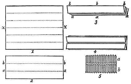 Mark off each of the edges which measure eighteen inches into six equal parts, each division being of course 326three inches long (see Fig. 1). Now double the paper on the line at x, and you have a shape like Fig. 2. Fold the uppermost half under at the line a a, and again outward at the line b b; then fold the under half in precisely the same manner, and your paper is like Fig. 3.