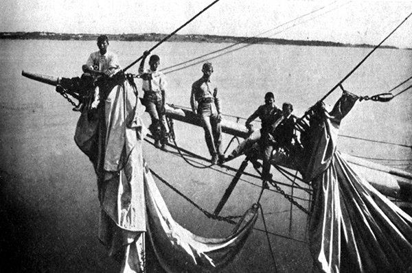 So, acting upon Fred’s suggestion, the Captain helped the sailors lower the mola into the water again and remove the yacht’s tackle. The procession started: first, Captain Ed, Billy and Dudley in the power boat, towing the rowboat with Fred and Paul in it. They in turn towed the sunfish, the latter at the end of the rope churning up the water as it careened after the boat.